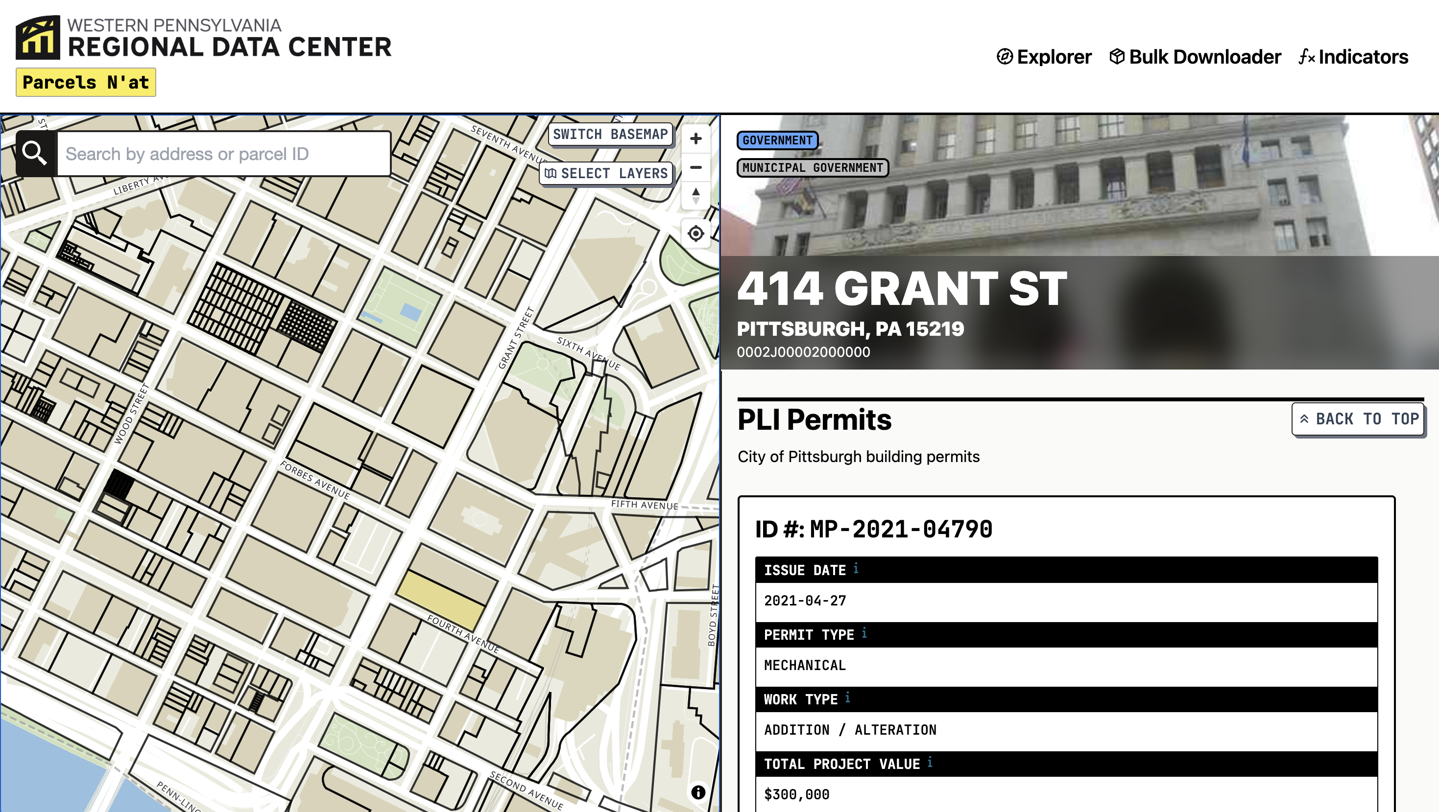 Data published on construction and demolition permits and code violations from the OneStop system are used by WPRDC in the exemplary project Parcels N’At, a data explorer and bulk download tool that provides data about parcels in Allegheny County.